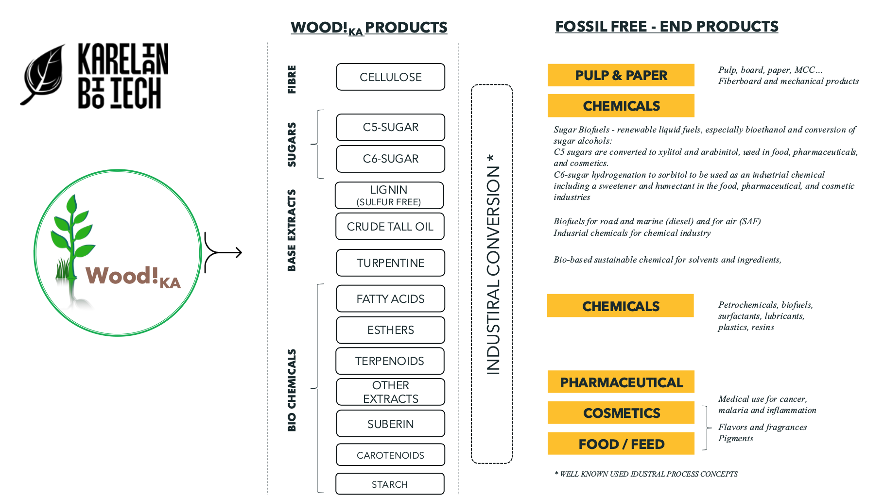 Utilization of side streams of fiber-based wood and biomaterials, for example logging waste, bark, leaves and biowaste.